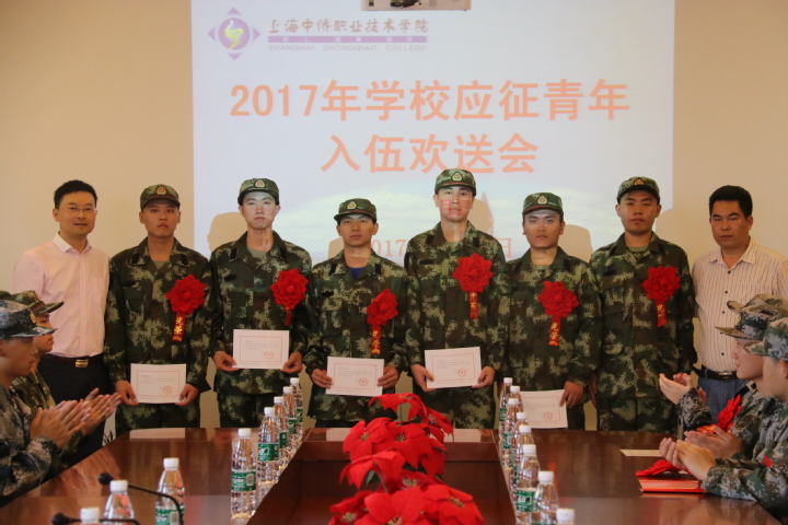 金秋送爽,又是一年送兵时。9月15日下午13:30,2017年应征入伍学生欢送会在图文信息楼518隆重举行。校长陈晓斌教授、校党委书记陈俊傲教授、各系书记、相关辅导员以及参军学生家长代表和47位参军学生共同参加会议。会议由武装部部长蒋成浩主持。 会议开始,首先由陈俊傲书记宣读入伍学生名单及所属参训部队,陈晓斌校长、陈俊傲书记为2017年上海中侨职业技术学院新兵颁发入伍通知书,同时邀请新兵家长一起为学生们佩戴上大红花,并与参军学生在这个光荣的时刻合影留念。