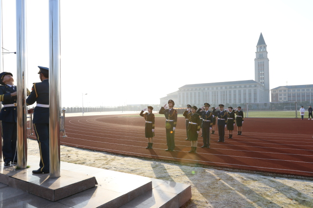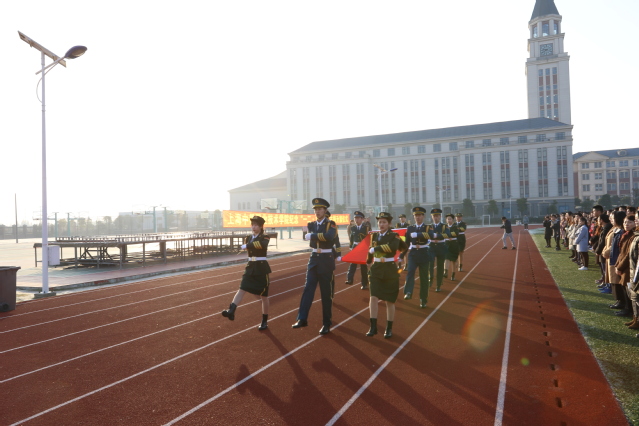 在全体师生的注目礼下,英姿飒爽的国旗护卫队队员们护送国旗进场,行礼完毕。伴随着庄严的《义勇军进行曲》的响起,五星红旗冉冉升起,迎风飘扬,肃然而立的师生们望着国旗目光中都怀揣着对祖国无限的热爱和至高无上的崇敬。