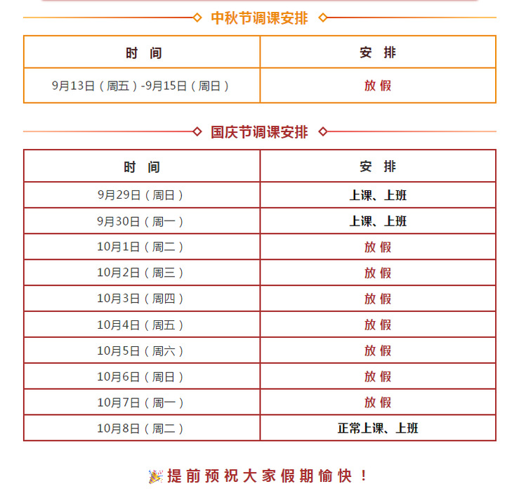 根据国务院办公厅关于2019年部分节假日安排的通知精神,结合我校实际,经校长办公会研究决定:一、中秋节的放假时间为9月13日(周五)至9月15日(周日),共3天。9月16日(周一)正常上班,上课。二、国庆节的放假时间为10月1日(周二)至10月7日(周一),共7天。9月29日(周日)教职工上班,学生补上10月4日(周五)的课。10月8日(周二)正常上班,上课。 特此通知 上海中侨职业技术学院 2019年9月2日