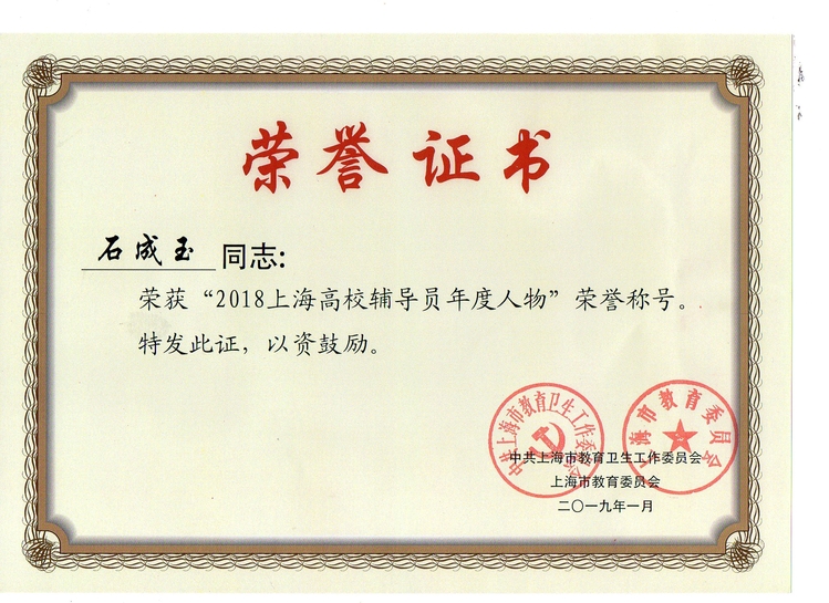 | 石成玉老师荣获“2018年上海高校辅导员年度人物” |